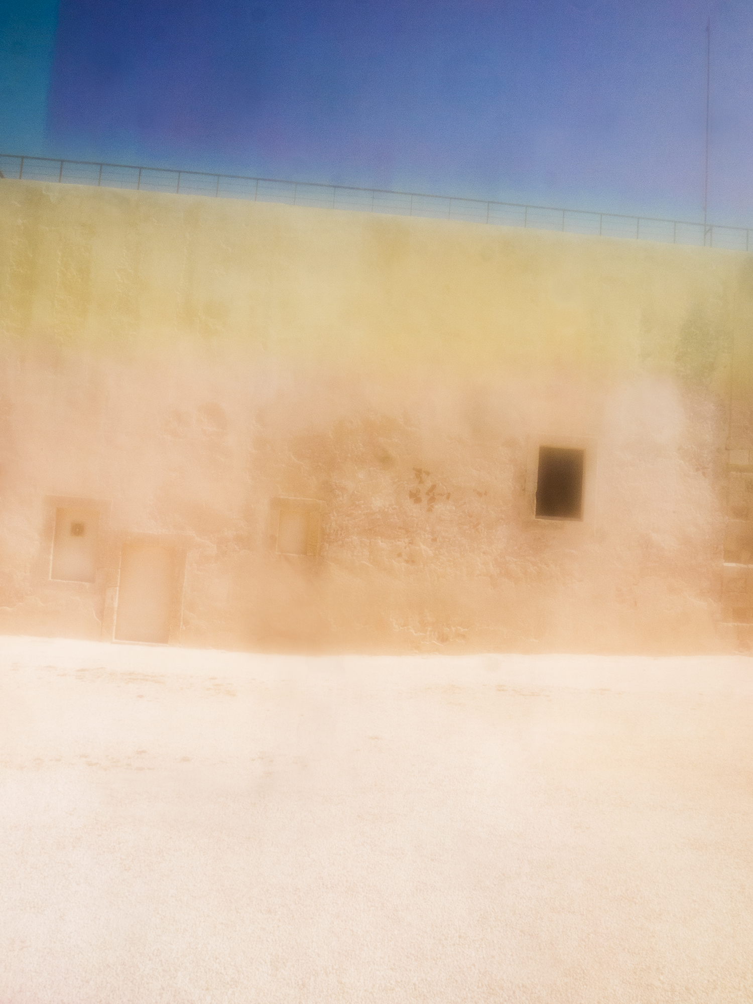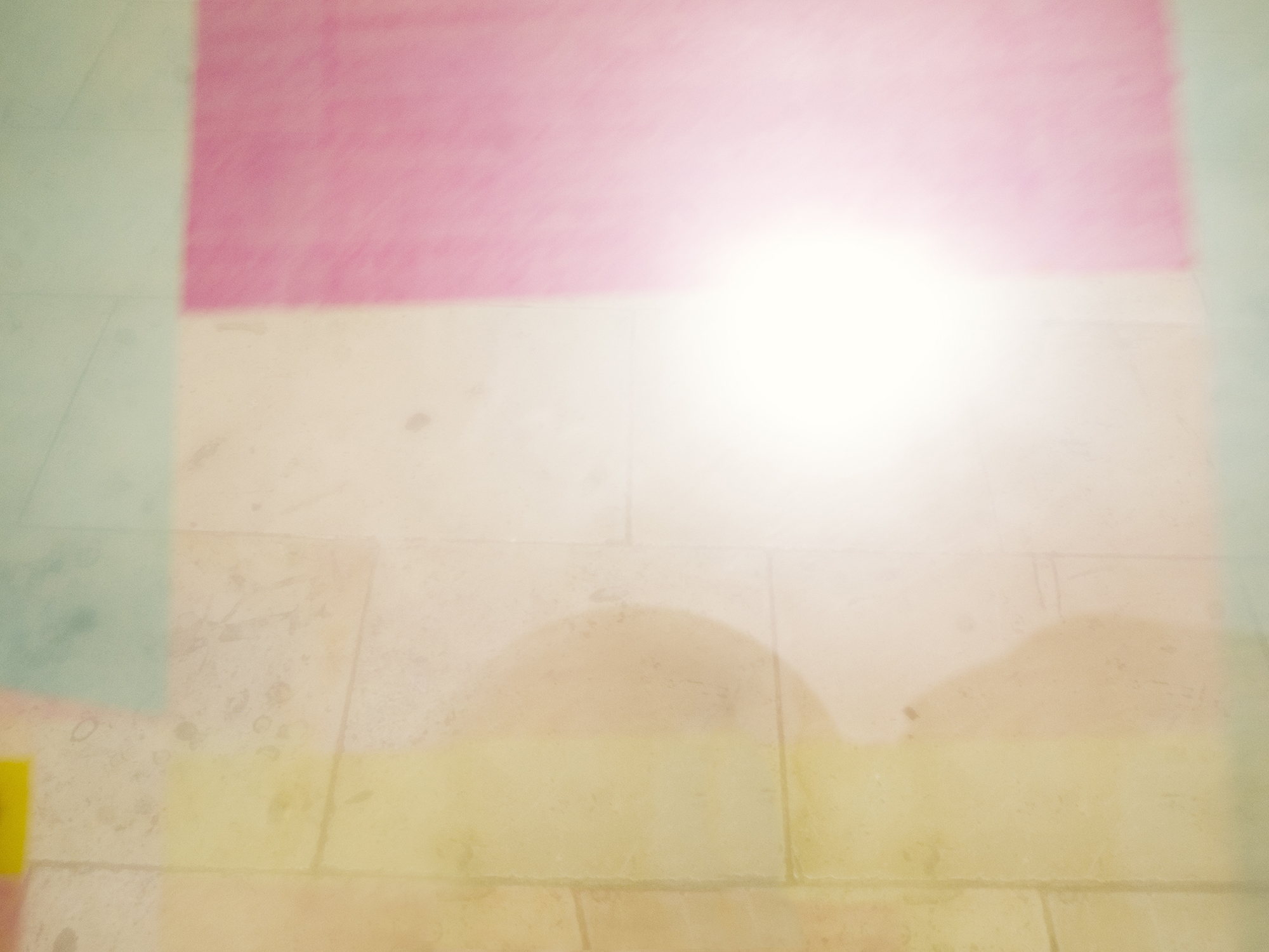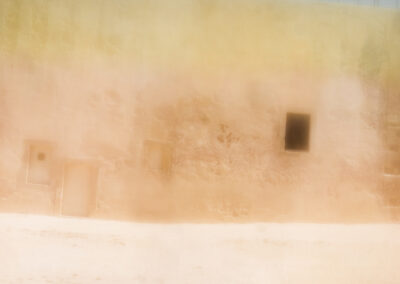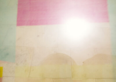Les couleurs peintes se mélangent avec les couleurs de l’environnement, elles changent l’unité de lumière et les rapports de couleurs, créant des télescopages d’espace, des superpositions de temps, et des seuils vers d’autres mondes.